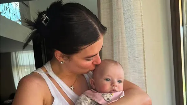 На світлині Катерина тримає маленьку Марію на руках та цілує в щічку. Донечка вже намагається позувати на камеру.