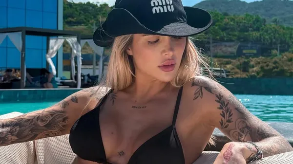 У крихітному чорному купальнику з вирізами та металевими кільцями, з мініспідницею на стегнах, вона виглядає як "спокуса, яка вийшла з спортзалу". Її фігура – броня, тату – мова зваби, а погляд у рожевих окулярах – постріл без попередження.